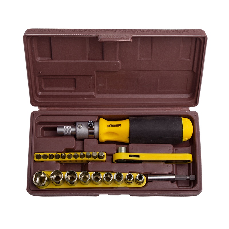 Предназначена для монтажа шлицевого крепежа. Хромованадиевая сталь повышенной твердости. Обрезиненная противоскользящая рукоятка с реверсивным механизмом. Набор из 23 предметов: торцевые головки — 5, 6, 7, 8, 9, 10, 11, 12, 13 мм , биты: плоский шлиц 5, 7 мм, крестовой шлиц #1, #2, #3, шестигранный шлиц #2, #3, #4, #5, #6, переходник, адаптер, плоская трещотка для бит.